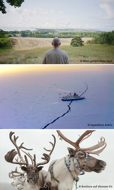 Gleich in mehreren Kategorien nominiert ist „Rentiere auf dünnem Eis“ von Henry M. Mix und Boas Schwarz. Der Film, der sich um den Deutschen Umwelt- und Nachhaltigkeitsfilmpreis, den Deutschen Wildlife Filmpreis und den NaturVision Kamerapreis bewirbt, geht der Frage nach, was „nur“ zwei Grad mehr für die Gebiete am russischen Polarkreis bedeuten. Hier stehen Menschen wie Tiere schon heute den Folgen des Klimawandels gegenüber. Die Auswirkungen erforscht auch die „Expedition Arktis“ von Philipp Grieß (nominiert für den NaturVision Kamerapreis). Der Untertitel des Films „Ein Jahr. Ein Schiff. Im Eis.“ zeigt, wohin die Reise buchstäblich geht. Die größte Arktis-Expedition aller Zeiten bringt Wissenschaftler aus aller Welt auf den Weg zum Nordpol. Ihr Auftrag: Daten sammeln über den Ozean, das Eis, die Atmosphäre und das Leben.
